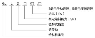 示例:客定給料能力為1000t/h,裝載功率為5.5KW的手動調速鏈帶式給料機型號表示為GLLD1000/5.5/S